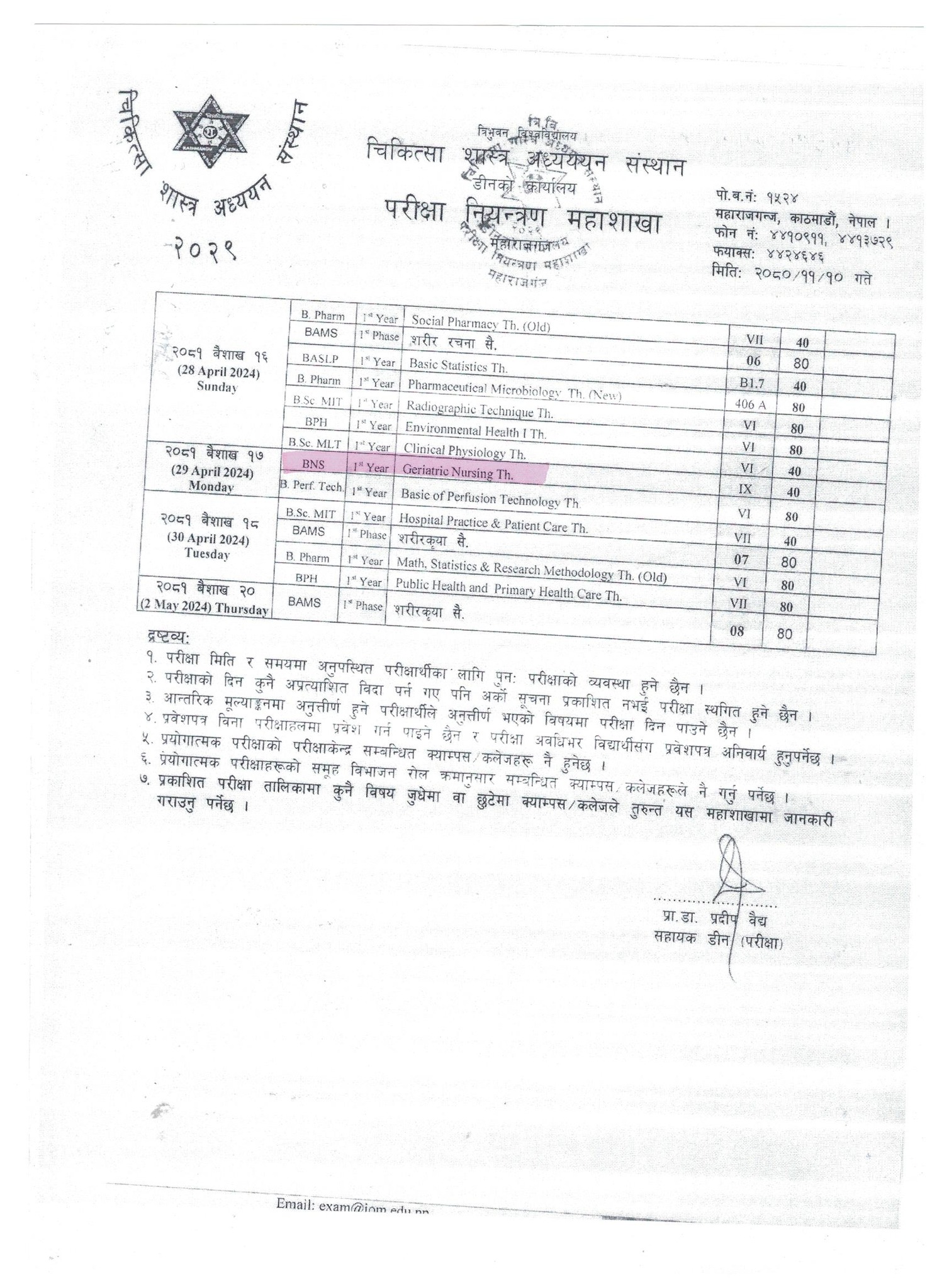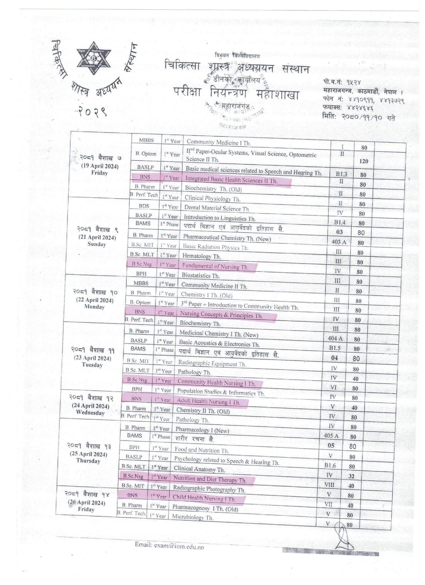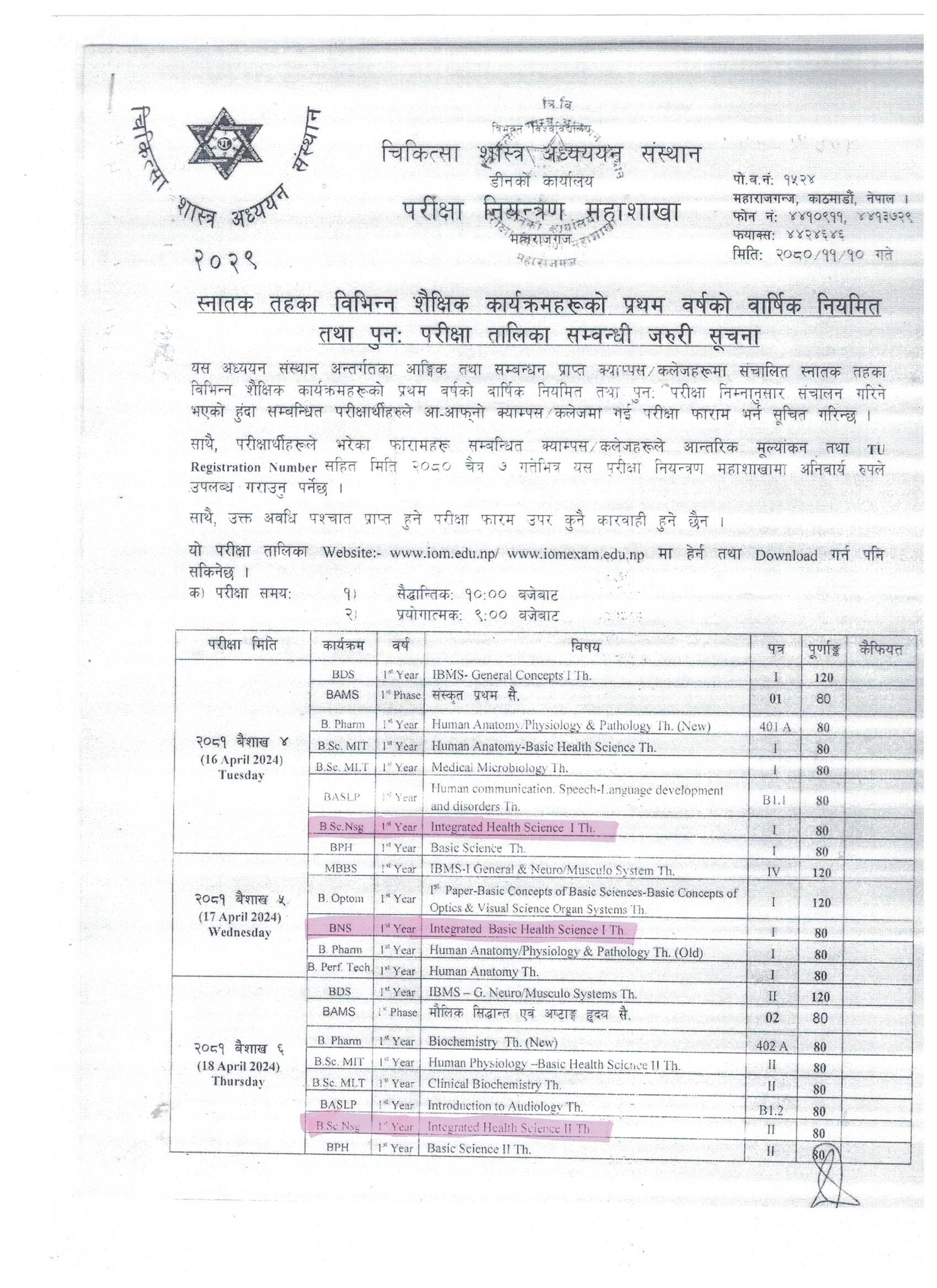 स्नातक तह BNS र B.Sc. Nursing प्रथम वर्षको वार्षिक नियमित तथा पुनः परीक्षा तालिका सम्बन्धी जरुरी सूचना