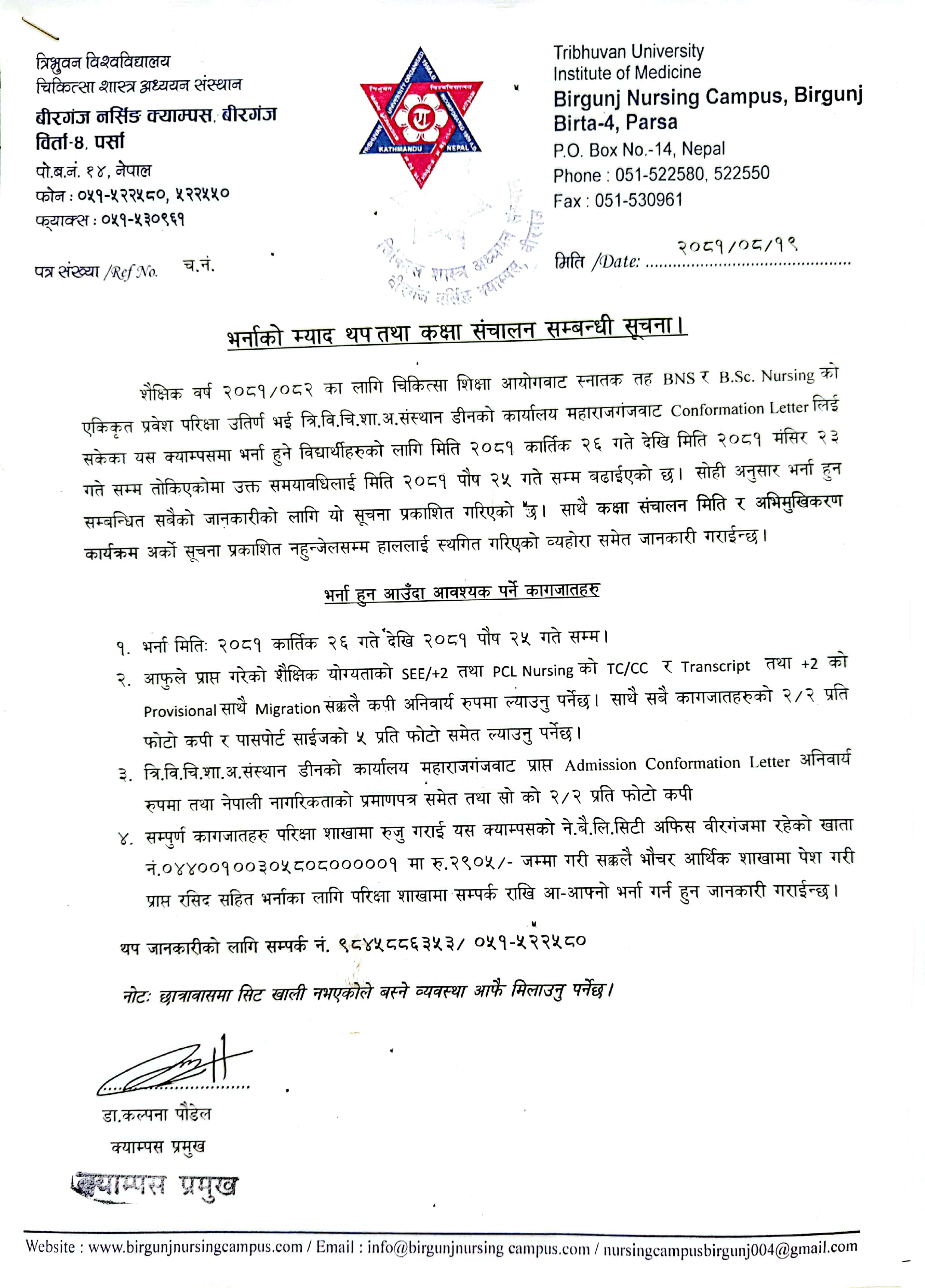 भर्ना म्याद थप तथा कक्षा संचालन सम्बन्धी सूचना।