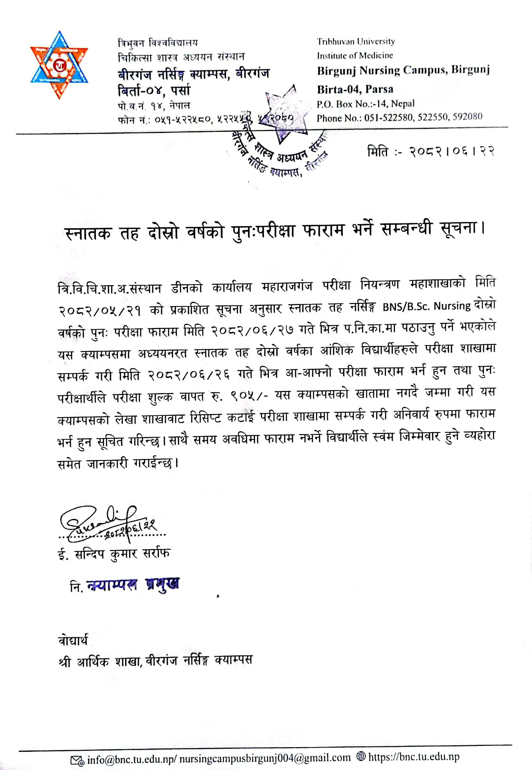 स्नातक तह दोस्रो वर्षको पुनःपरीक्षा फाराम भर्ने सम्बन्धी सूचना।