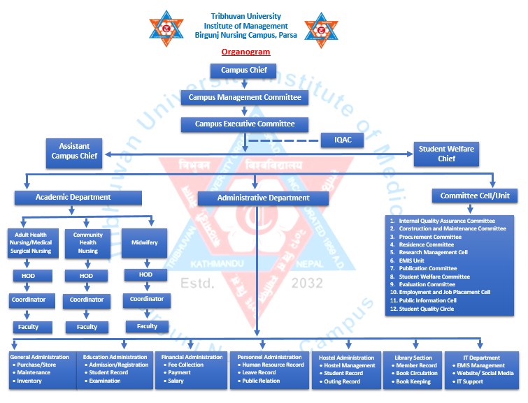Birgunj Nursing Campus (BNC) was established in 2032 BS, which is a constituent campus of Tribhuvan University, Institute of Medicine (T.U.I.O.M) with a mandate to work towards developing socially responsible and competent health workforce, providing health care and engaging in health research. The Institute is located in northern Nepal and it has extended its continued health services through teaching district concept to Primary Health Care Centers, District Hospitals and sub-regional Hospitals in three districts of the region. The campus is only one government campus of nursing existing in Madhesh Pradesh. The Institute is located in eastern Nepal and it has extended its continued health services through teaching district concept to Primary Health Care Centers, District Hospitals and Zonal Hospitals in eight districts of the region.